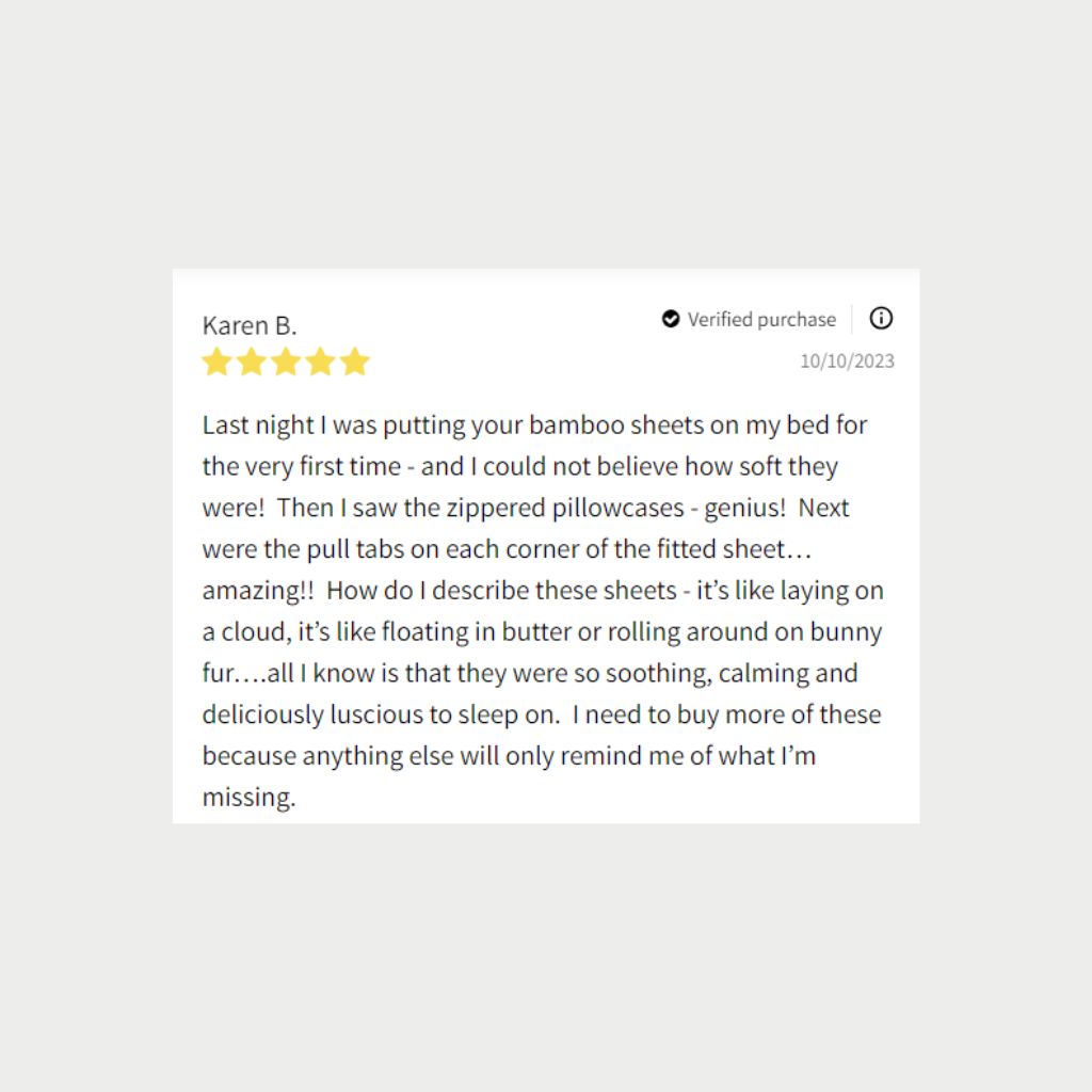 Last night I was putting your bamboo sheets on my bed for the very first time - and I could not believe how soft they were! Then I saw the zippered pillowcases - genius! Next were the pull tabs on each corner of the fitted sheet…amazing!! How do I describe these sheets - it’s like laying on a cloud, it’s like floating in butter or rolling around on bunny fur….all I know is that they were so soothing, calming and deliciously luscious to sleep on. I need to buy more of these because anything else will only remind me of what I’m missing.